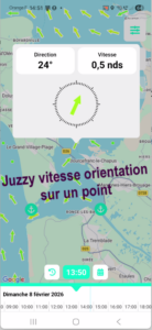 Des flèches indiquent la direction du courant. Si on clique sur l’une d’elles on a l’affichage de la vitesse et de l’angle du courant.